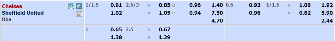- Mức kèo nhà cái cược chấp trận này: Chelsea chấp 1,25 trái. Chelsea ăn 0,91. Sheffield Utd ăn 1,02