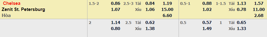 - Mức kèo nhà cái đưa ra trận này: Chelsea chấp 1,75 Trái. Chelsea ăn 0,86. Zenit ăn 1,07