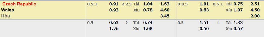 - Mức kèo nhà cái đưa ra trận này: Cộng hòa Séc chấp 0,75 Trái. Cộng hòa Séc ăn 0,91. Wales ăn 0,93