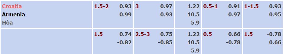 - Mức kèo nhà cái cược chấp trận này: Croatia chấp 1,75 Trái. Croatia ăn 0,93. Armenia ăn 0,99