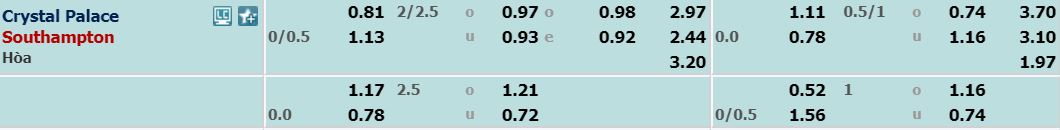 - Mức kèo chấp kèo nhà cái hôm nay đưa ra cho cả trận: Southampton chấp 0,25 trái. Crystal Palace ăn 0,81. Southampton ăn 1,13