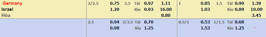 - Mức kèo nhà cái đưa ra trận này: Đức chấp 2,5 Trái. Đức ăn 0,94. Israrel ăn 0,98