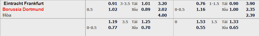 - Mức kèo nhà cái đưa ra trận này: Dortmund chấp 0,5 Trái. Frankfurt ăn 0,91. Dortmund ăn 1,02