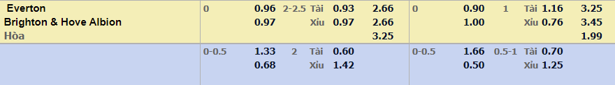 - Mức kèo nhà cái cược chấp trận này: Hòa – Được – Thua. Everton ăn 0,96. Brighton ăn 0,97