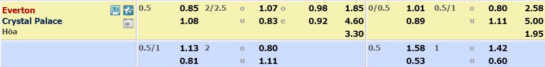 - Mức kèo nhà cái cược chấp trận này: Everton chấp 0,5 Trái. Everton ăn 0,85. Crystal Palace ăn 1,08