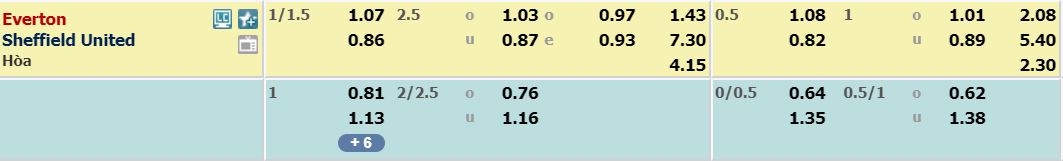 - Mức kèo nhà cái cược chấp trận này: Everton ăn 1,25 Trái. Everton ăn 1,07. Sheffield Utd ăn 0,86