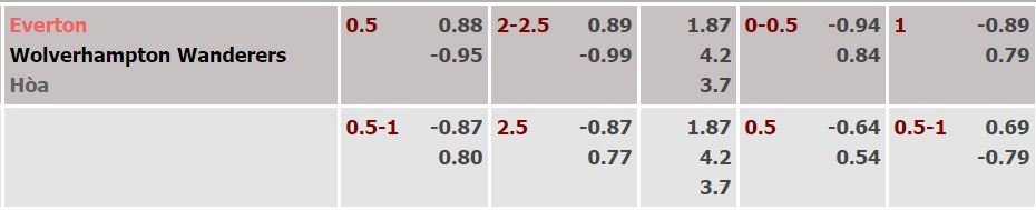 - Mức kèo nhà cái cược chấp trận này: Everton chấp 0,5 Trái. Everton ăn 0,88. Wolves ăn 1,00