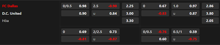 - Mức kèo nhà cái cược chấp trận này: Dallas chấp 0,25 Trái. Dallas ăn 0,98. DC Utd ăn 0,90