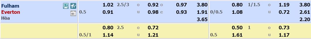 - Mức kèo nhà cái cược chấp trận này: Everton chấp 0,5 trái. Fulham ăn 1,02. Everton ăn 0,91