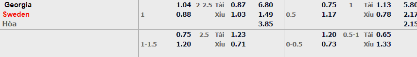 - Mức kèo nhà cái đưa ra trận này: Thụy Điển chấp 2 trái. Georgia ăn 1,04. Thụy Điển ăn 0,88
