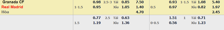 - Mức kèo nhà cái cược chấp trận này: Real Madrid chấp 1,25 Trái. Granada CF ăn 0,98. Real Madrid ăn 0,95