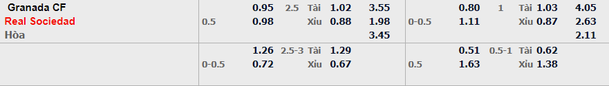 - Mức kèo nhà cái đưa ra trận này: Real Sociedad chấp 0,5 Trái. Granada CF ăn 0,95. Real Sociedad ăn 0,98
