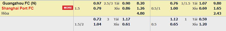 - Mức kèo nhà cái đưa ra trận này: Shanghai Port chấp 1,5 Trái. Guangzhou ăn 0,97. Shanghai Port ăn 0,79