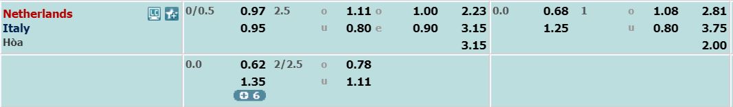 - Mức kèo chấp kèo nhà cái hôm nay đưa ra cho cả trận: Hà Lan chấp 0,25 trái. Hà Lan ăn 0,97. Ý ăn 0,95