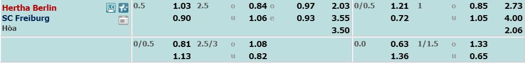 - Mức kèo nhà cái cược chấp trận này: Hertha Berlin chấp 0,5 Trái. Hertha Berlin ăn 1,03. SC Freiburg ăn 0,90