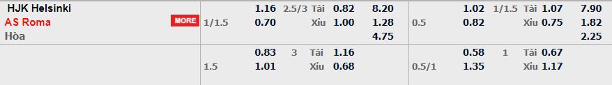 - Mức tỷ lệ kèo nhà cái hôm nay, cược chấp trận này: AS Roma chấp 1,5 trái. HJK ăn 0,83. AS Roma ăn 1,01
