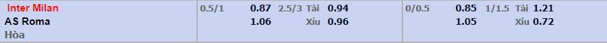 - Mức kèo nhà cái đưa ra trận này: Inter Milan chấp 0,75 Trái. Inter Milan ăn 0,87. AS Roma ăn 1,06