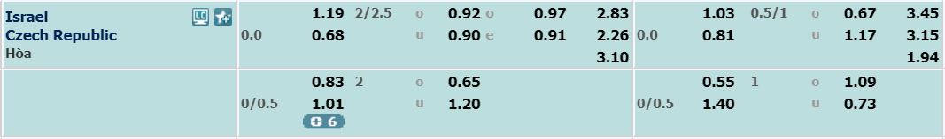 - Mức kèo nhà cái cược chấp trận này: Cộng hòa Séc chấp 0,25 trái. Israel ăn 0,83. Cộng hòa Séc ăn 1,01