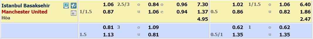 - Mức kèo nhà cái cược chấp trận này: Man Utd chấp 1,25 trái. Istanbul Basaksehir ăn 1,06. Man Utd ăn 0,87