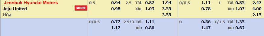 - Mức kèo nhà cái đưa ra trận này: Jeonbuk chấp 0,5 Trái. Jeonbuk ăn 0,94. Jeju Utd ăn 0,98