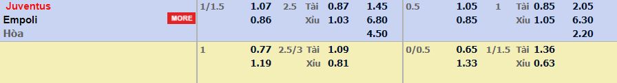 - Mức kèonhàcái cược chấp trận này: Juventus chấp 1,25 trái. Juventus ăn 1,07. Empoli ăn 0,86