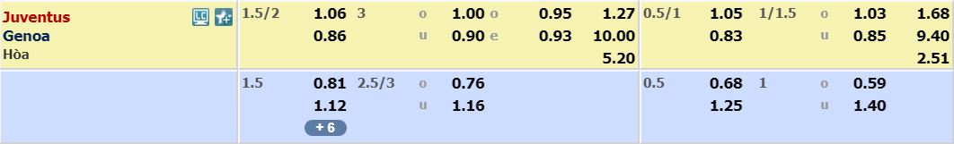 - Mức kèo nhà cái cược chấp trận này: Juventus chấp 1,75 trái. Juventus ăn 1.06. Genoa ăn 0,86