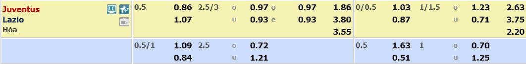 - Mức kèo bóng đá cược chấp nhà cái đưa ra cho cả trận: Juventus chấp 0,5 Trái. Juventus ăn 0,86. Lazio ăn 1,07