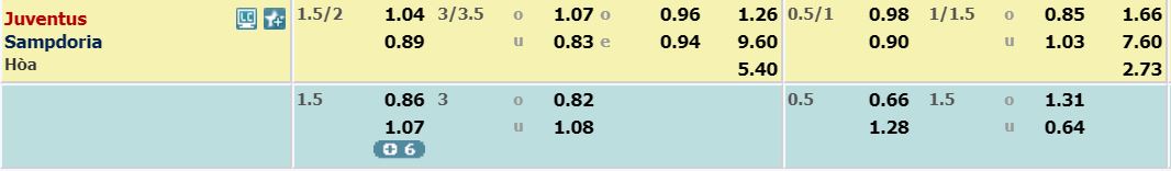 - Mức kèo chấp nhà cái đưa ra cho cả trận: Juventus chấp 1,75 trái. Juventus ăn 1,04. Sampdoria ăn 0,89