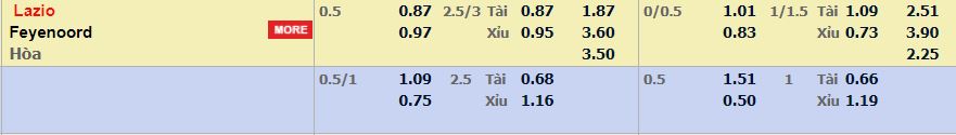 - Mức kèo nhà cái V9bet cược chấp trận này: Lazio chấp 0,5 Trái. Lazio ăn 0,87. Feyenoord ăn 0,97