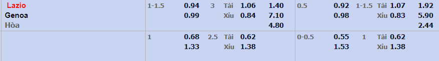 - Mức kèo nhà cái đưa ra trận này: Lazio chấp 1,25 Trái. Lazio ăn 0,94. Genoa ăn 0,99
