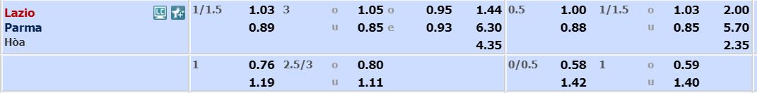 - Mức kèo bóng đá cược chấp nhà cái đưa ra cho cả trận: Lazio chấp 1,25 trái. Lazio ăn 1,03. Parma ăn 0,89.