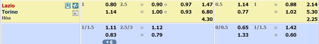 - Mức kèo bóng đá cược chấp nhà cái đưa ra cho cả trận: Lazio chấp 1 Trái. Lazio ăn 0,80. Torino ăn 1,14.