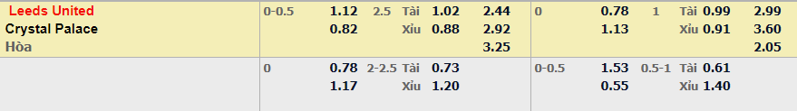 - Mức kèo nhà cái đưa ra trận này: Leeds Utd chấp 0,25 Trái, Leeds Utd ăn 1,12. Crystal Palace ăn 0,82
