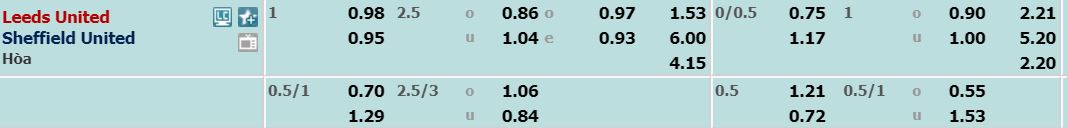 - Mức kèo nhà cái cược chấp trận này: Leeds Utd chấp 1 trái. Leeds Utd ăn 0,98. Sheffield Utd ăn 0,95
