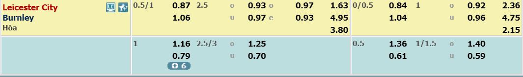 - Mức kèo chấp Châu Á nhà cái hôm nay đưa ra cho cả trận: Leicester City chấp 0,75 trái. Leicester City ăn 0,87. Burnley ăn 1,06