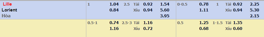 - Mức kèo nhà cái đưa ra trận này: Lille OSC chấp 1 trái, Lille ăn 1,04. Lorient ăn 0,84
