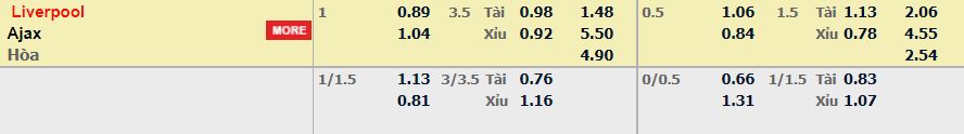 - Mức kèo nhà cái cược chấp trận này: Liverpool chấp 1 Trái. Liverpool ăn 0,89. Ajax ăn 1,04