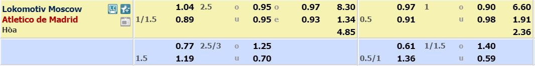 - Mức kèo nhà cái cược chấp trận này: Atl Madrid chấp 1,25 trái. Lokomotiv Moscow ăn 1,04. Atl Madrid ăn 0,89