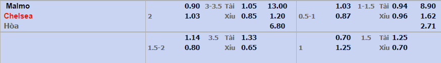 - Mức kèo nhà cái đưa ra trận này: Chelsea chấp 2 trái, Malmo FF ăn 0,90. Chelsea ăn 1,03