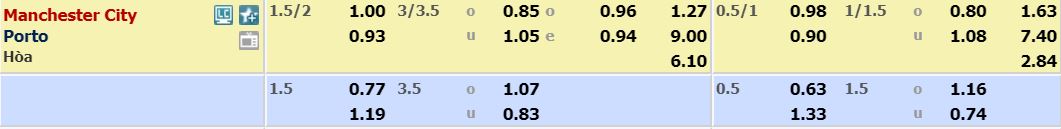 - Mức kèo nhà cái cược chấp trận này: Man City chấp 1,75 trái. Man City ăn 1,00. Porto ăn 0,93