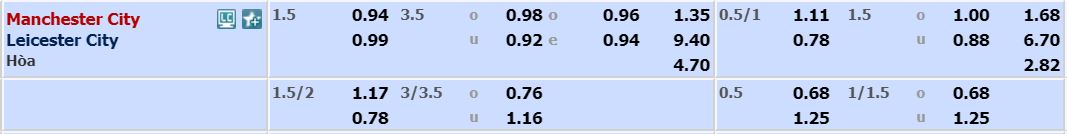 - Mức kèo chấp nhà cái đưa ra cho cả trận: Manchester City chấp 1,5 trái. Manchester City ăn 0,94. Leicester City ăn 0,99