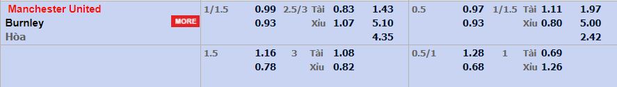 - Mức kèo nhà cái cược chấp trận này: Man Utd chấp 1,25 Trái. Man Utd ăn 0,99. Burnley ăn 0,93