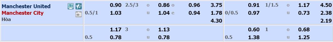 - Mức kèo bóng đá cược chấp nhà cái đưa ra cho cả trận: Manchester City chấp 0,75 trái. Manchester Utd ăn 0,90. Manchester City ăn 1,03