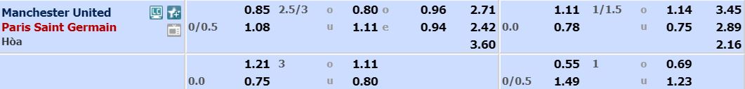- Mức kèo bóng đá cược chấp nhà cái đưa ra cho cả trận: Paris SG chấp 0,25 trái. Manchester Utd ăn 0,85. Paris SG ăn 1,08