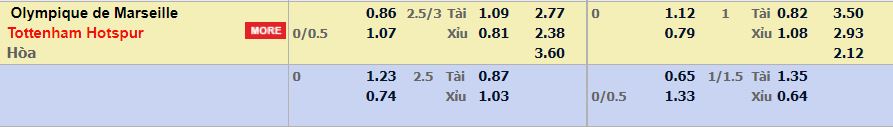 - Mức kèo nhà cái cược chấp trận này: Tottenham chấp 0,25 trái. Marseille ăn 0,86. Tottenham ăn 1,07