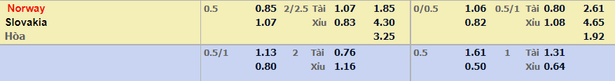 - Mức kèo nhà cái đưa ra trận này: Na Uy chấp 0,5 Trái. Na Uy ăn 0,85. Slovakia ăn 1,07