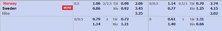 - Mức kèo nhà cái đưa ra trận này: Na Uy chấp 0,5 Trái, Na Uy ăn 1,06. Thụy Điển ăn 0,86