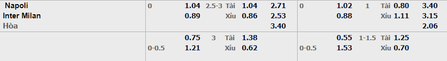 - Mức kèo nhà cái đưa ra trận này: Hòa – Được – Thua, Napoli ăn 1,04. Inter Milan ăn 0,89