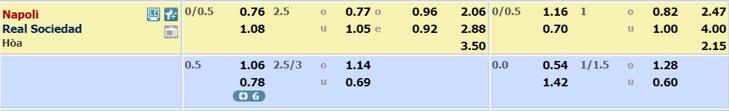 - Mức kèo bóng đá cược chấp nhà cái đưa ra cho cả trận: Napoli chấp 0,25 trái. Napoli ăn 0,76. Real Sociedad ăn 1,08