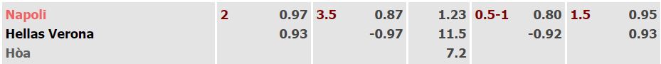 - Mức kèo nhà cái cược chấp trận này: Napoli chấp 2 Trái. Napoli ăn 0,97. Verona ăn 0,93